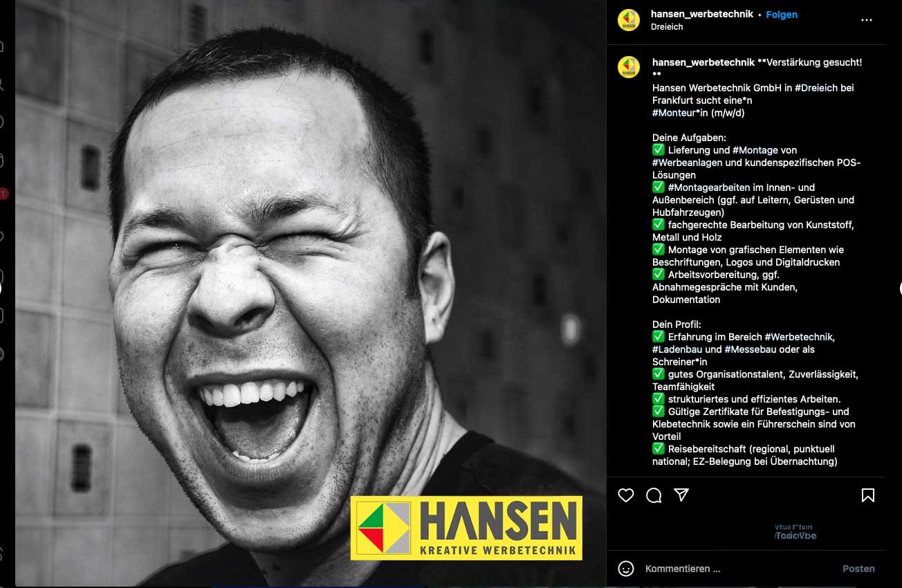 Die Gewinnung von qualifizierten Fachkräften und talentierten Quereinsteigern stellt viele Unternehmen vor große Herausforderungen. Für Hansen Werbetechnik haben wir eine maßgeschneiderte Personalmarketing-Kampagne entwickelt, die kreative Ansprache und zielgerichtete Kommunikation vereint. Gezielte Ansprache: Nutzung innovativer Werbetechniken auf digitalen und analogen Kanälen, um potenzielle Mitarbeiter dort zu erreichen, wo sie sind. Employer Branding: Stärkung der Arbeitgebermarke durch authentische Geschichten, die Einblicke in den Arbeitsalltag und Entwicklungsmöglichkeiten geben. Attraktive Inhalte: Interaktive Formate wie Videos, Testimonials und moderne Visuals, die die Werte und Benefits von Hansen Werbetechnik vermitteln. Das Ergebnis: Eine höhere Sichtbarkeit als Arbeitgeber und ein spürbarer Zuwachs an qualifizierten Bewerbungen. Diese Kampagne zeigt, wie durch kreatives Personalmarketing Unternehmen im Wettbewerb um Talente überzeugen können. Konzeption, Text, Design und Realisierung